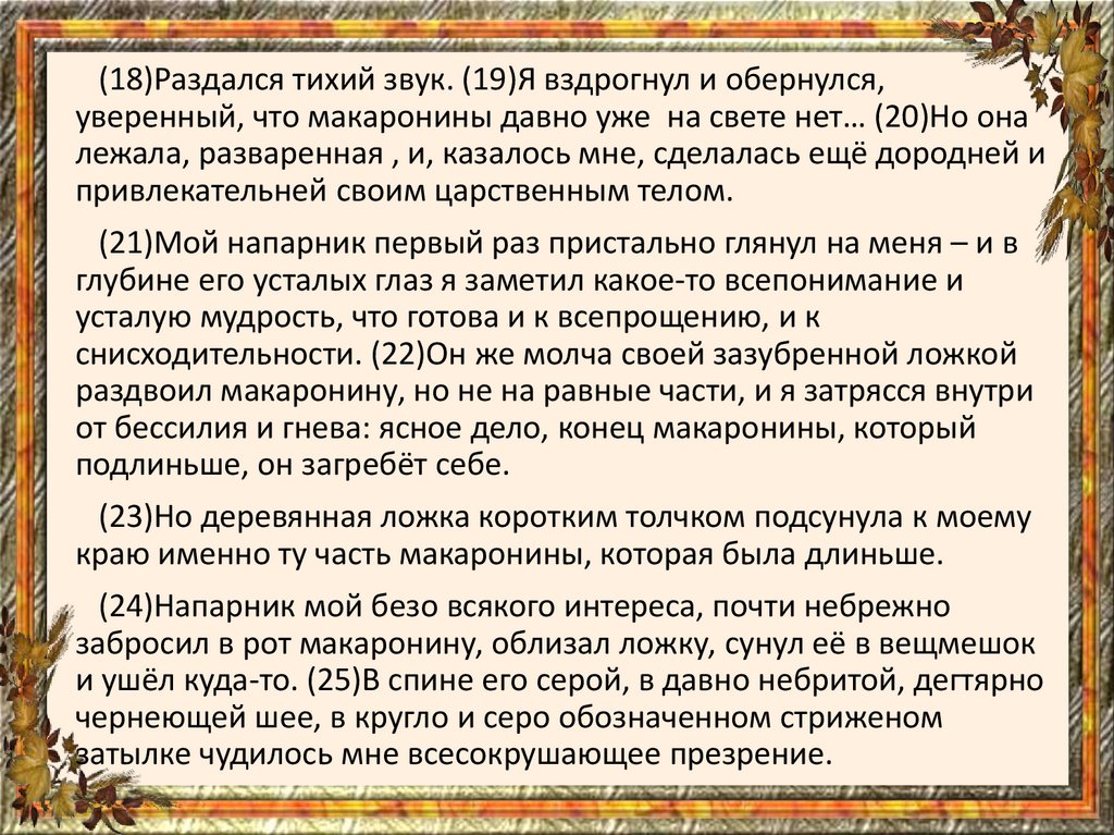 (18)Раздался тихий звук. (19)Я вздрогнул и обернулся,уверенный, что макаронины давно уже на свете нет… (20)Но она