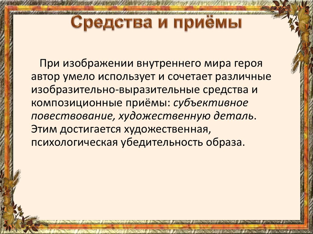 При изображении внутреннего мира герояавтор умело использует и сочетает различные
