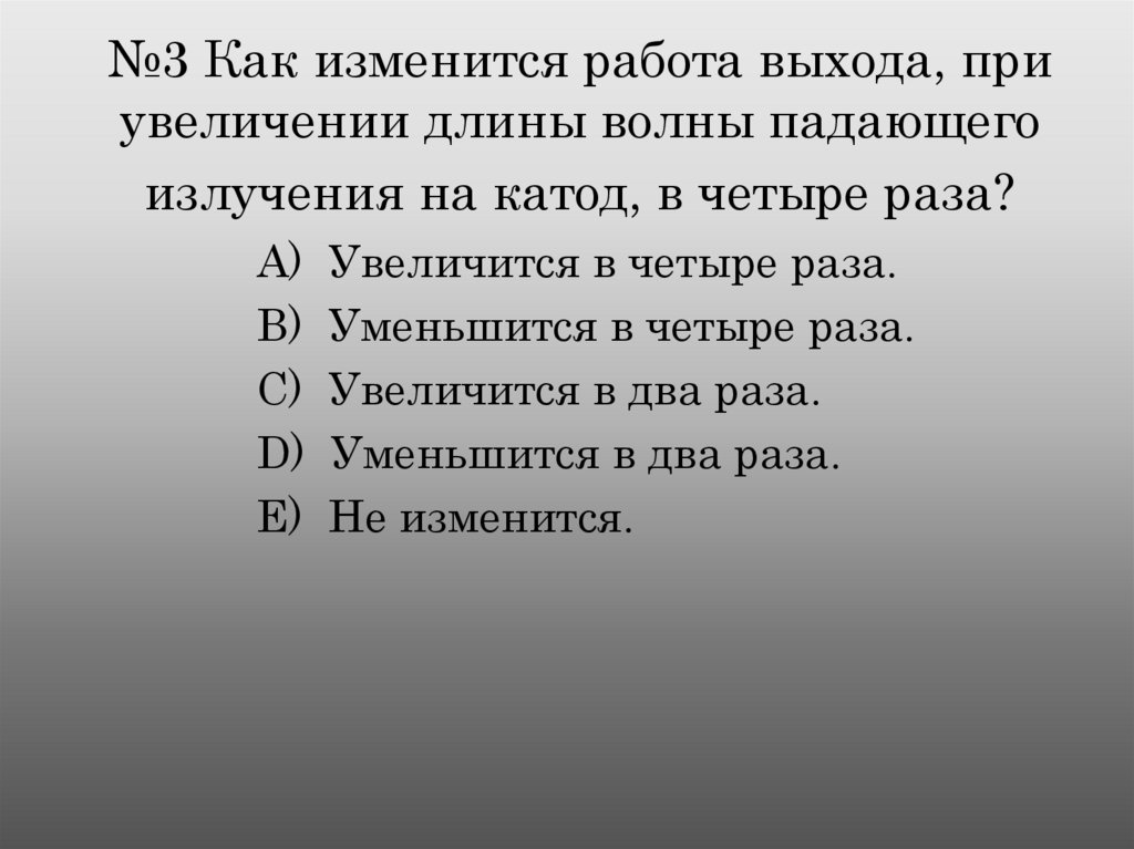 №3 Как изменится работа выхода, приувеличении длины волны падающего