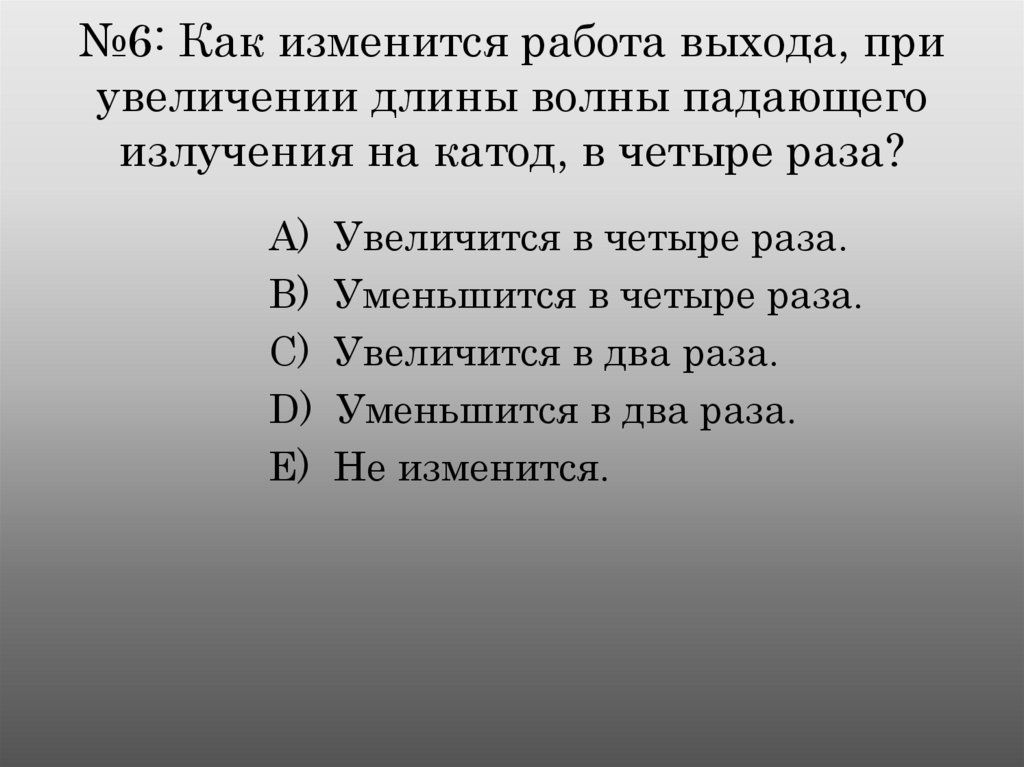 №6: Как изменится работа выхода, приувеличении длины волны падающего