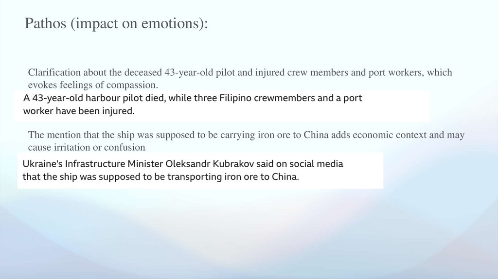 Pathos (impact on emotions):Clarification about the deceased 43-year-old pilot and injured crew members and port workers, which