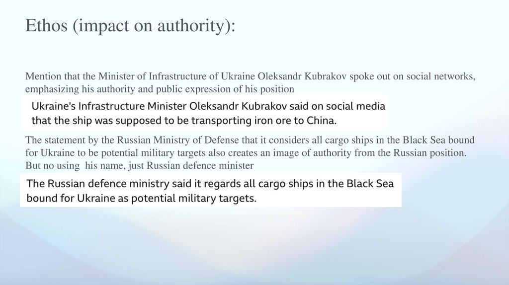 Ethos (impact on authority):Mention that the Minister of Infrastructure of Ukraine Oleksandr Kubrakov spoke out on social networks,