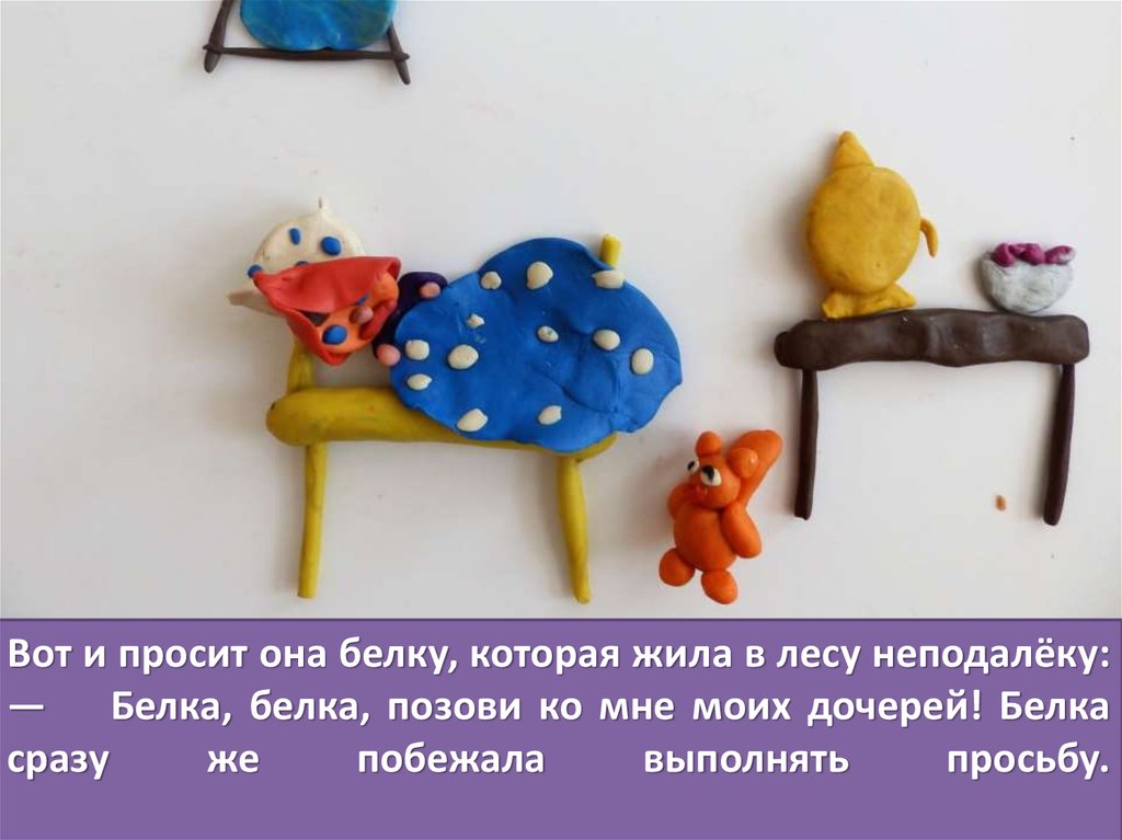 Вот и просит она белку, которая жила в лесу неподалёку:— Белка, белка, позови ко мне моих дочерей! Белка