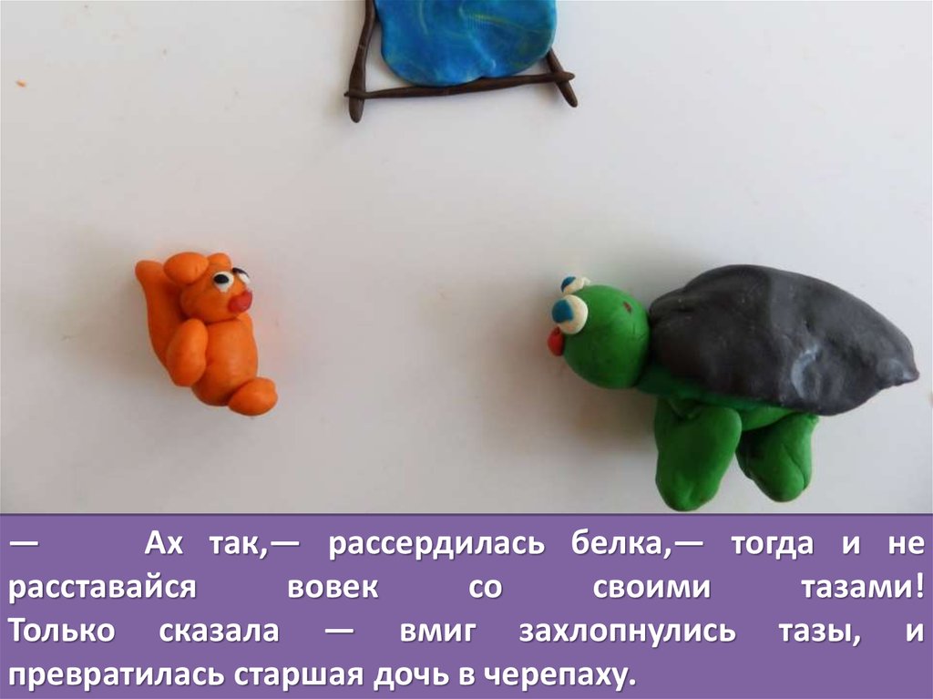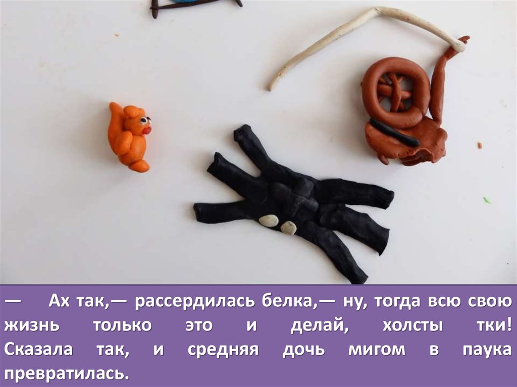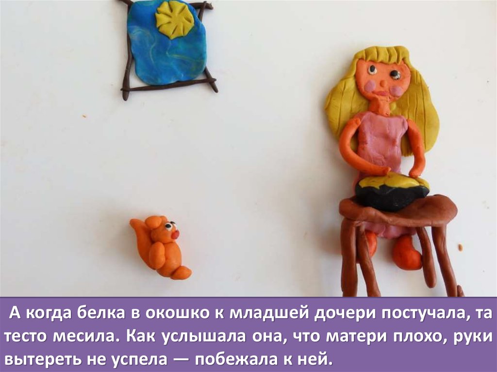 А когда белка в окошко к младшей дочери постучала, татесто месила. Как услышала она, что матери плохо, руки