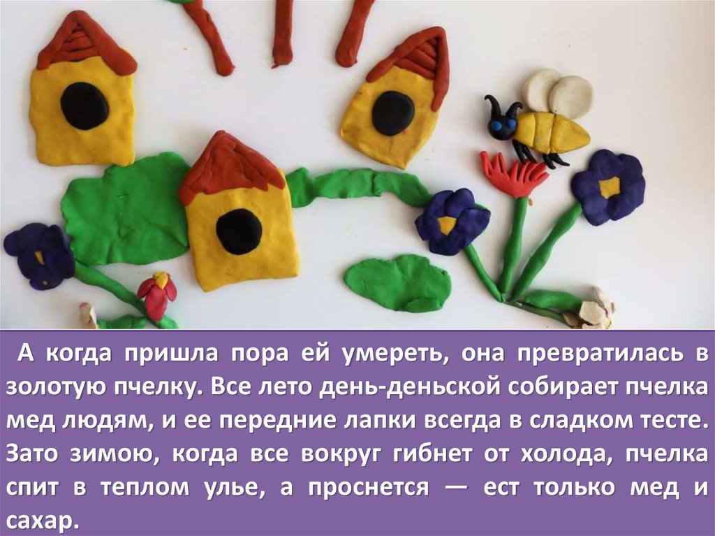 А когда пришла пора ей умереть, она превратилась взолотую пчелку. Все лето день-деньской собирает пчелка