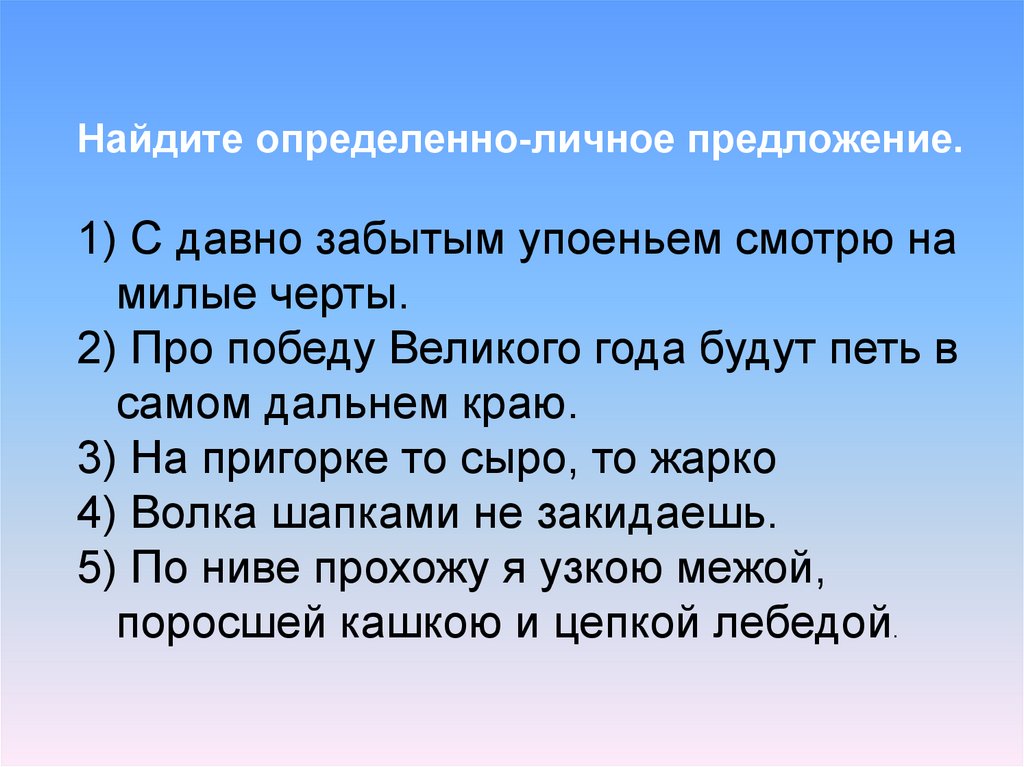 Найдите определенно-личное предложение.1) С давно забытым упоеньем смотрю на