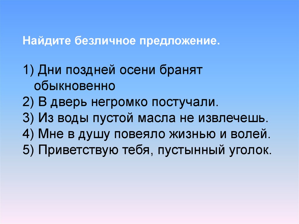 Найдите безличное предложение.1) Дни поздней осени бранят