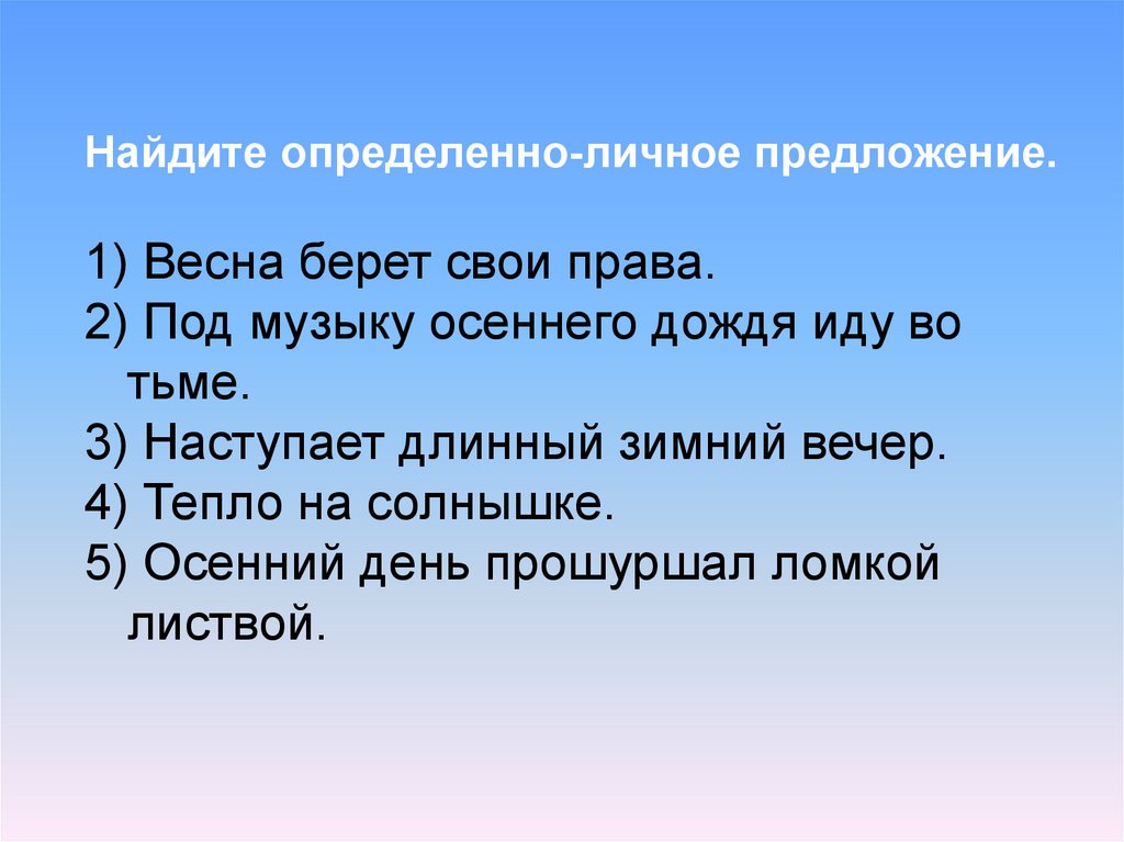 Найдите определенно-личное предложение.1) Весна берет свои права.
