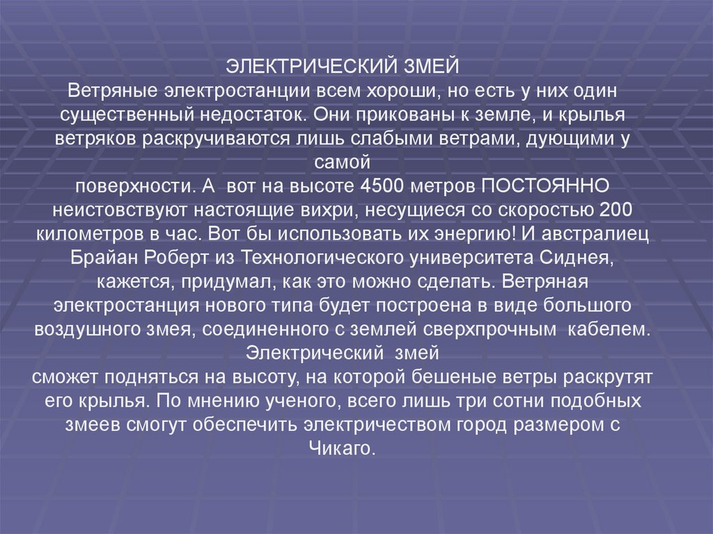 ЭЛЕКТРИЧЕСКИЙ ЗМЕЙВетряные электростанции всем хороши, но есть у них один