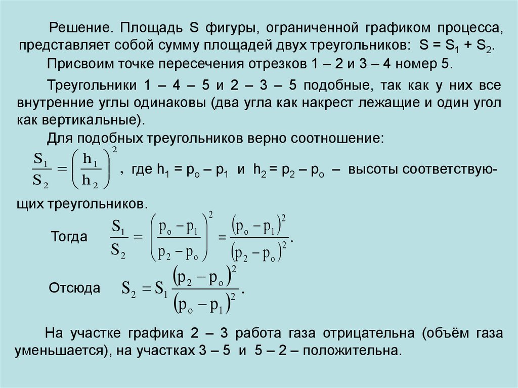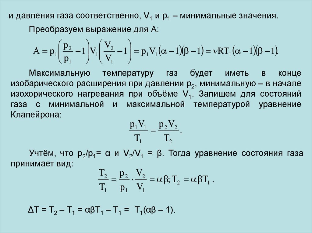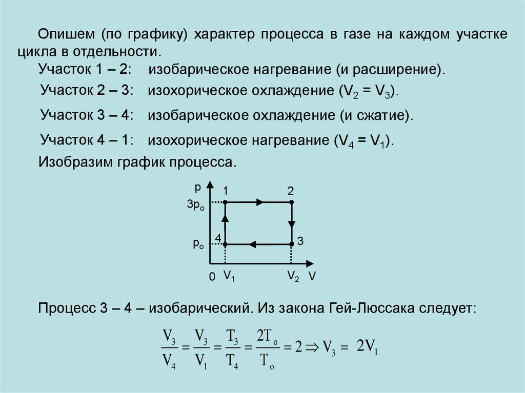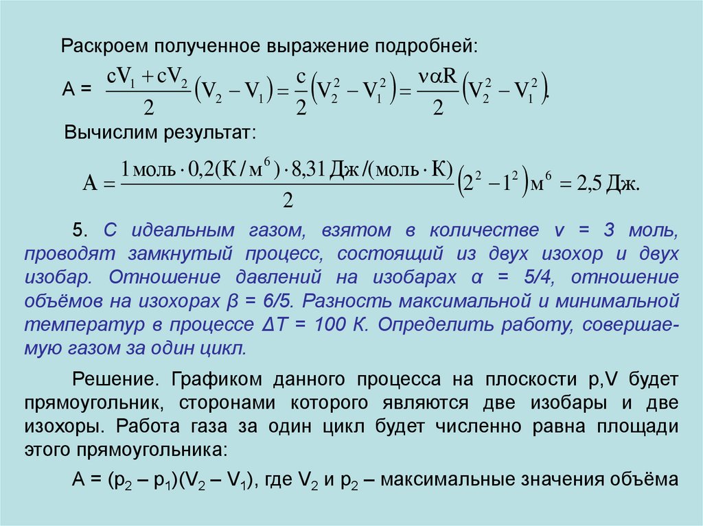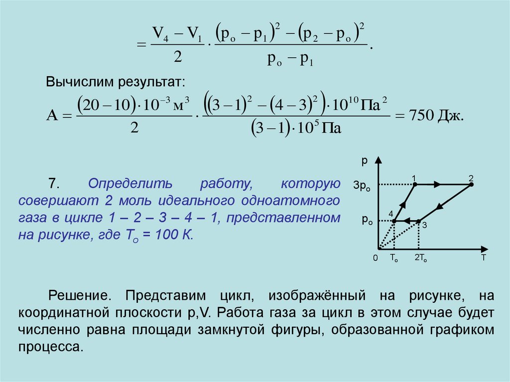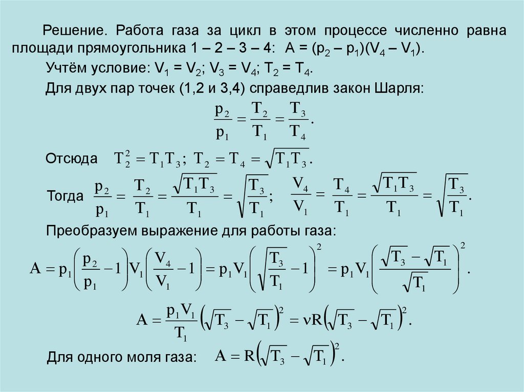 Решение. Работа газа за цикл в этом процессе численно равнаплощади прямоугольника 1 – 2 – 3 – 4: А = (р2 – р1)(V4 – V1).