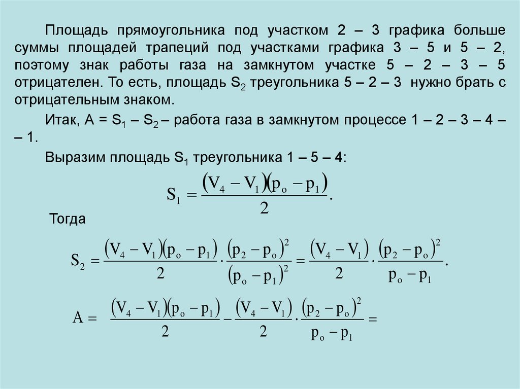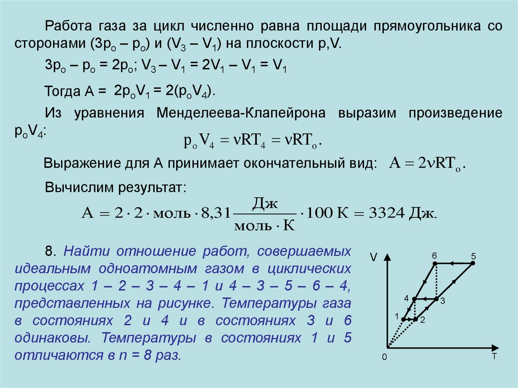 Работа газа за цикл численно равна площади прямоугольника состоронами (3ро – ро) и (V3 – V1) на плоскости р,V.