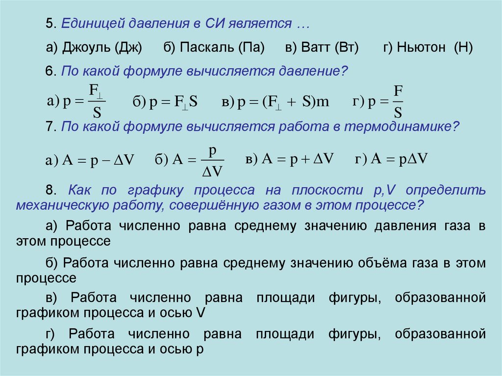 5. Единицей давления в СИ является …а) Джоуль (Дж)