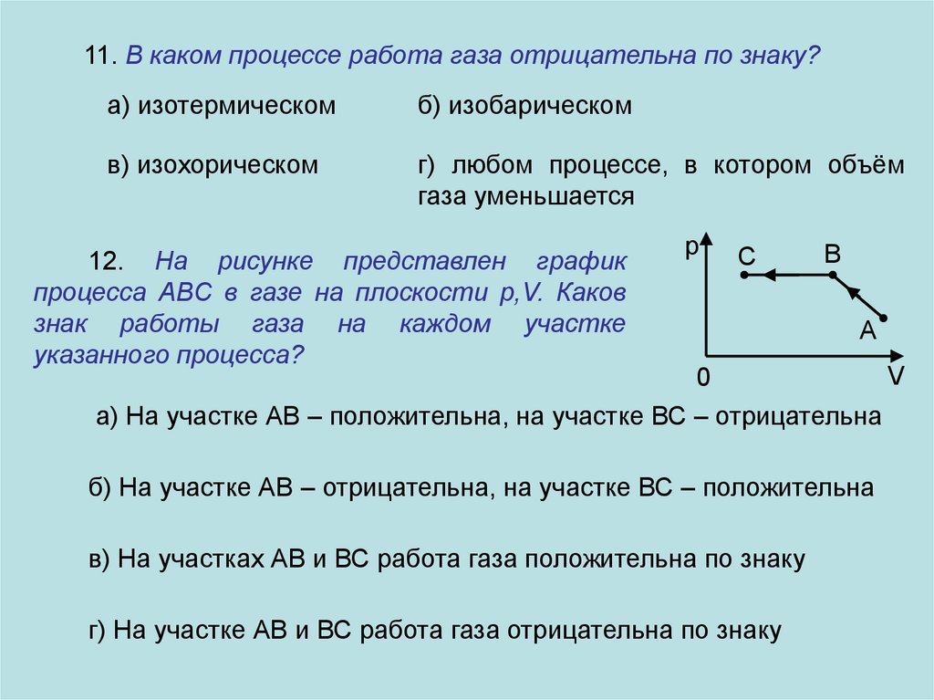 11. В каком процессе работа газа отрицательна по знаку?а) изотермическом