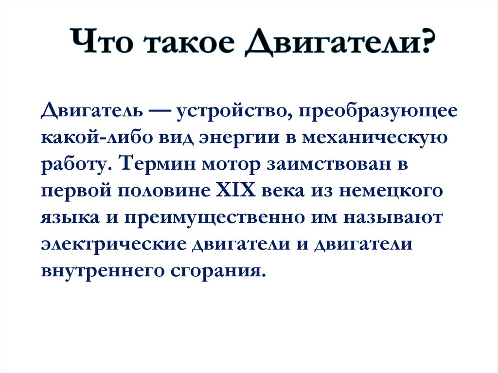Двигатель — устройство, преобразующеекакой-либо вид энергии в механическую
