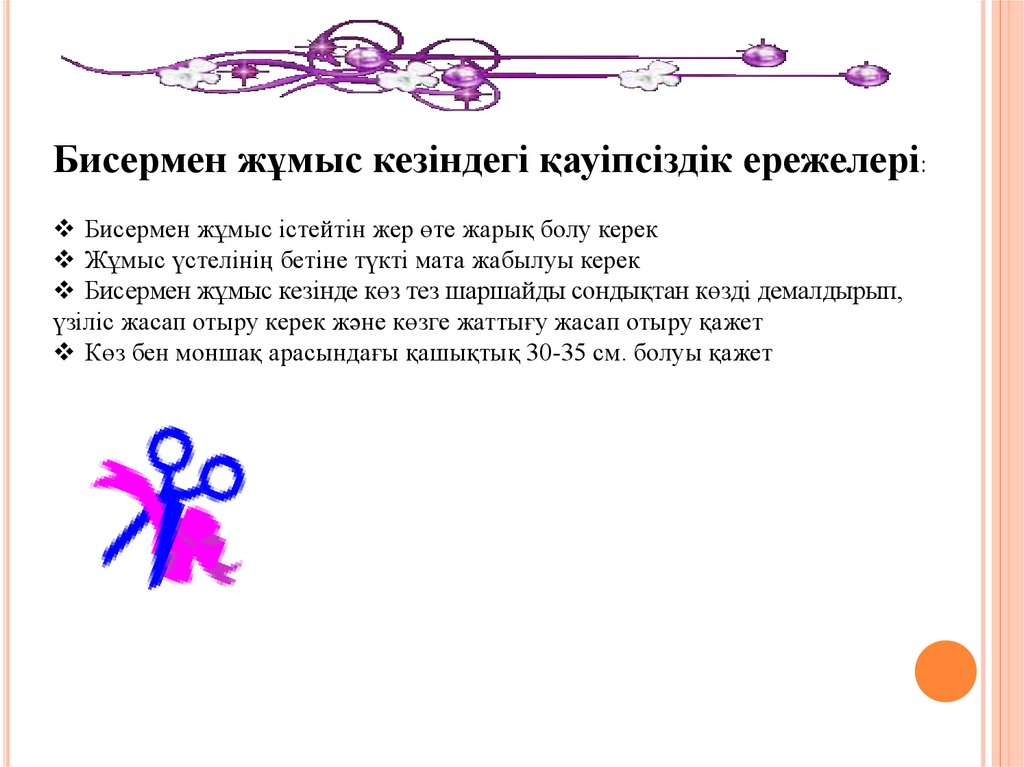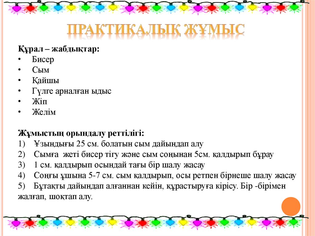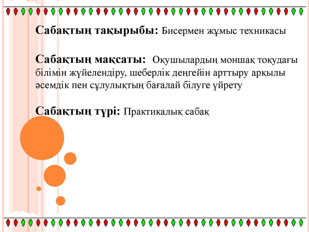 Сабақтың тақырыбы: Бисермен жұмыс техникасыСабақтың мақсаты: Оқушылардың моншақ тоқудағы