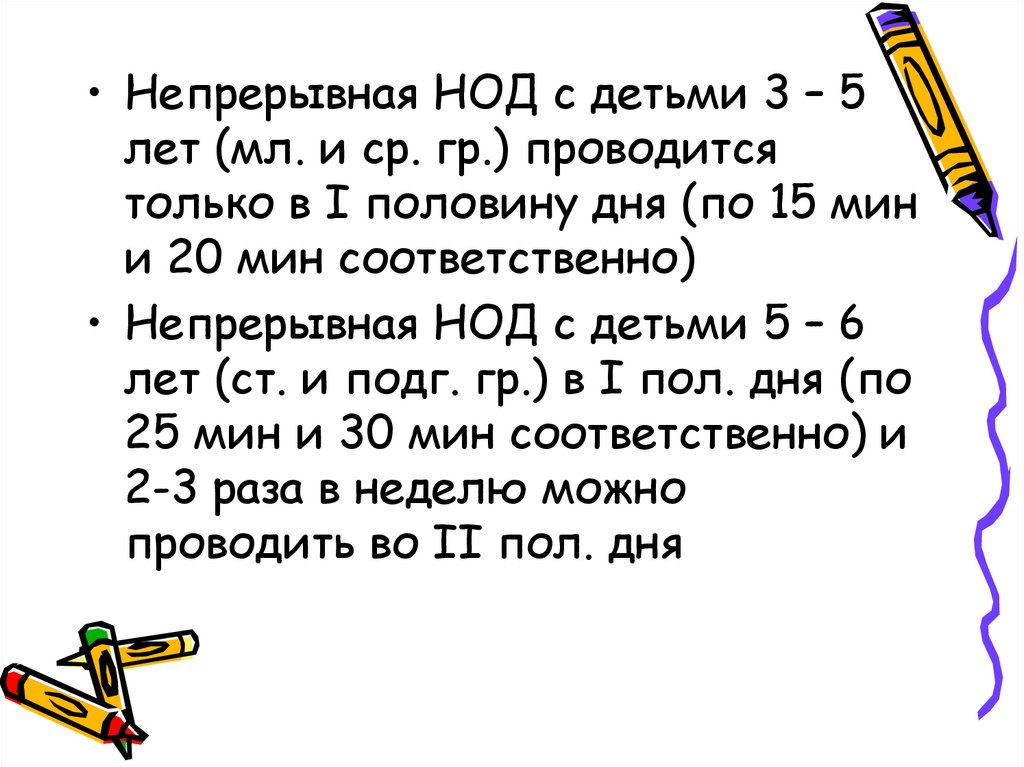 • С детьми 5 – 7 лет НОД не болееодного в течение дня и не чаще 3