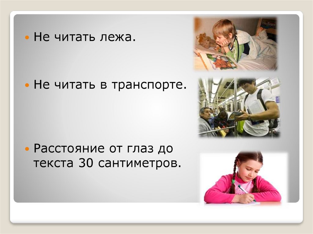 Не читать лежа.Не читать в транспорте.