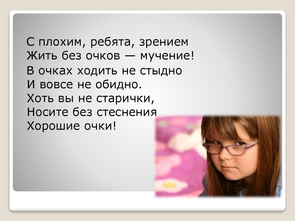 С плохим, ребята, зрениемЖить без очков — мучение!