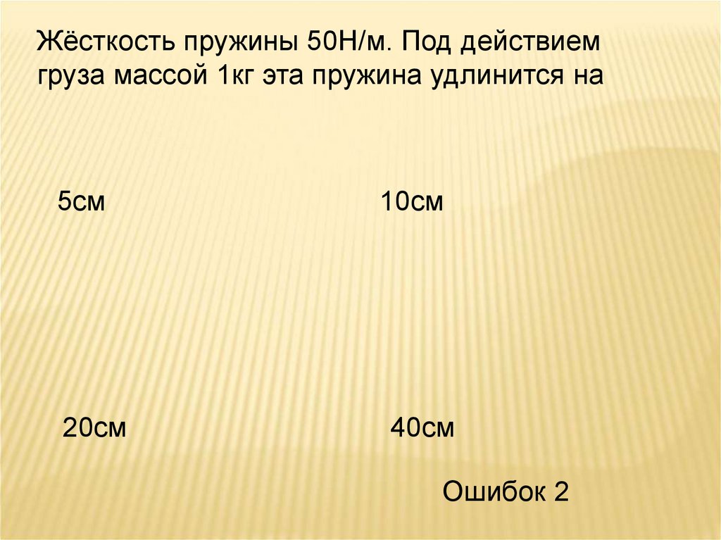 Жёсткость пружины 50Н/м. Под действиемгруза массой 1кг эта пружина удлинится на