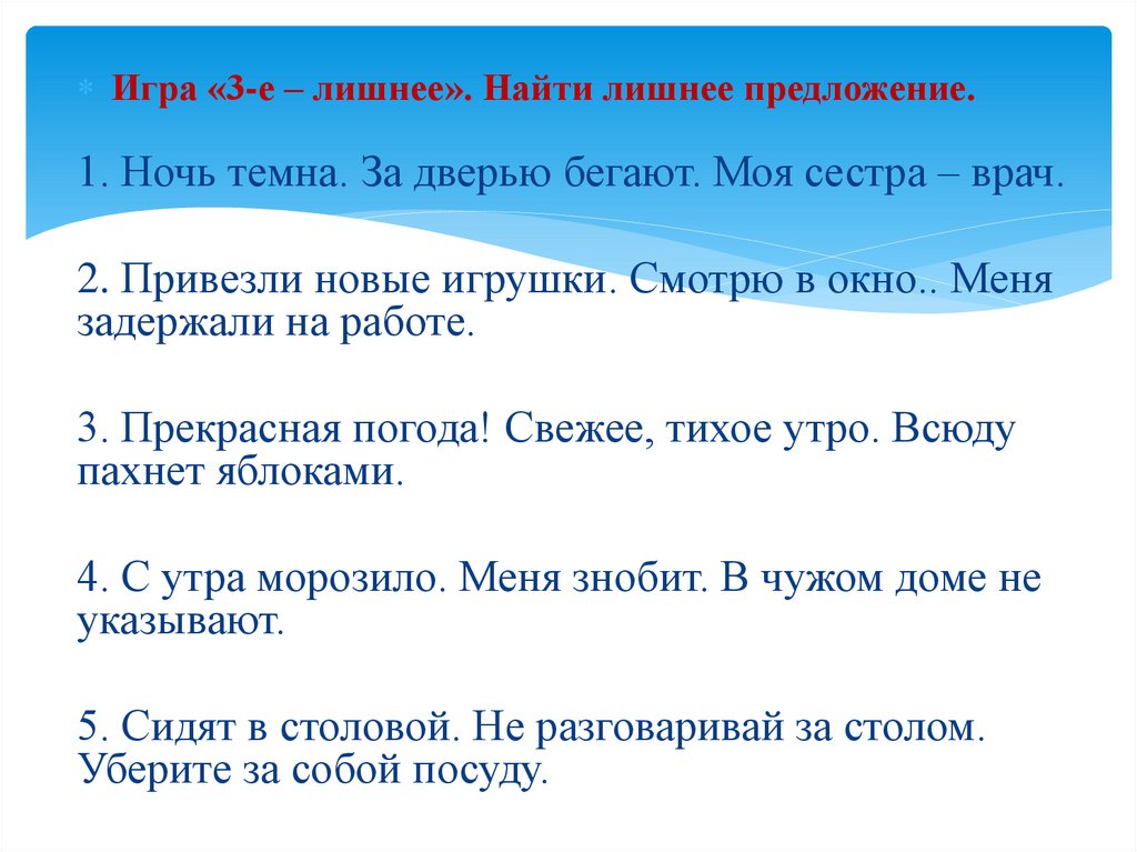 Игра «3-е – лишнее». Найти лишнее предложение.1. Ночь темна. За дверью бегают. Моя сестра – врач.