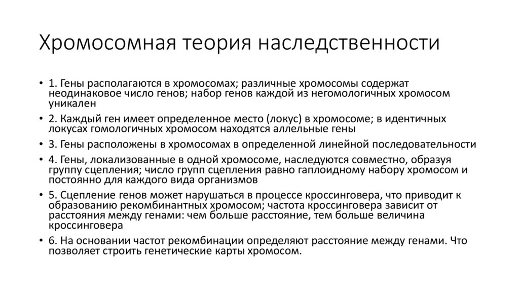 Хромосомная теория наследственности• 1. Гены располагаются в хромосомах; различные хромосомы содержат