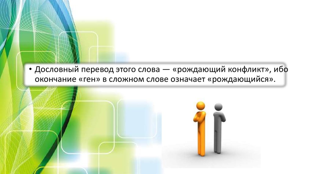 • Дословный перевод этого слова — «рождающий конфликт», ибоокончание «ген» в сложном слове означает «рождающийся».