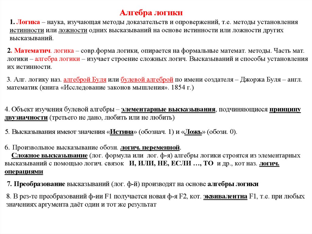 логики – алгебра логики – изучает строение сложных логич. Высказываний и способы установления