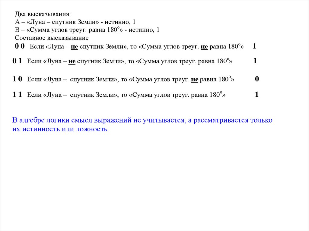 0 1 Если «Луна – не спутник Земли», то «Сумма углов треуг. равна 180о»