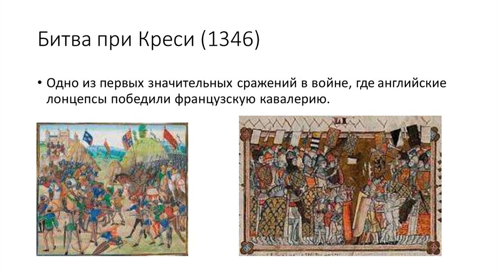 Битва при Креси (1346)• Одно из первых значительных сражений в войне, где английские