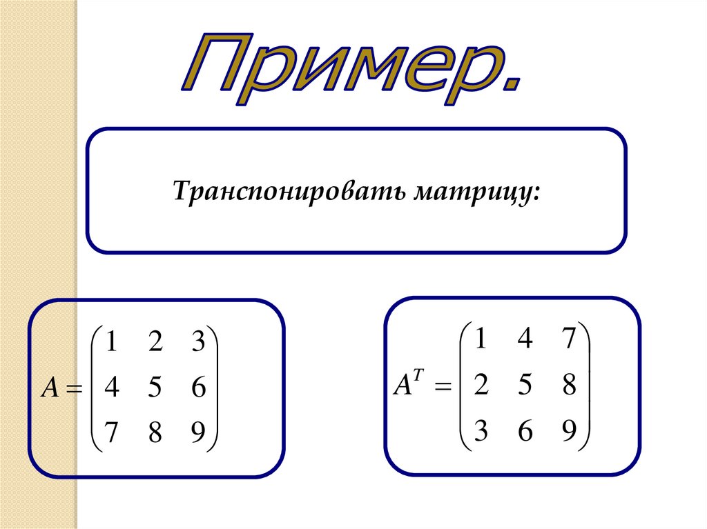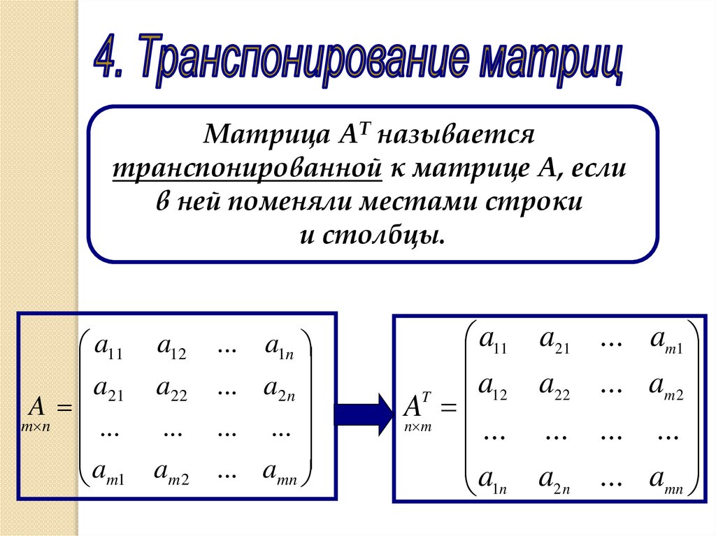 Матрица АТ называетсятранспонированной к матрице А, если