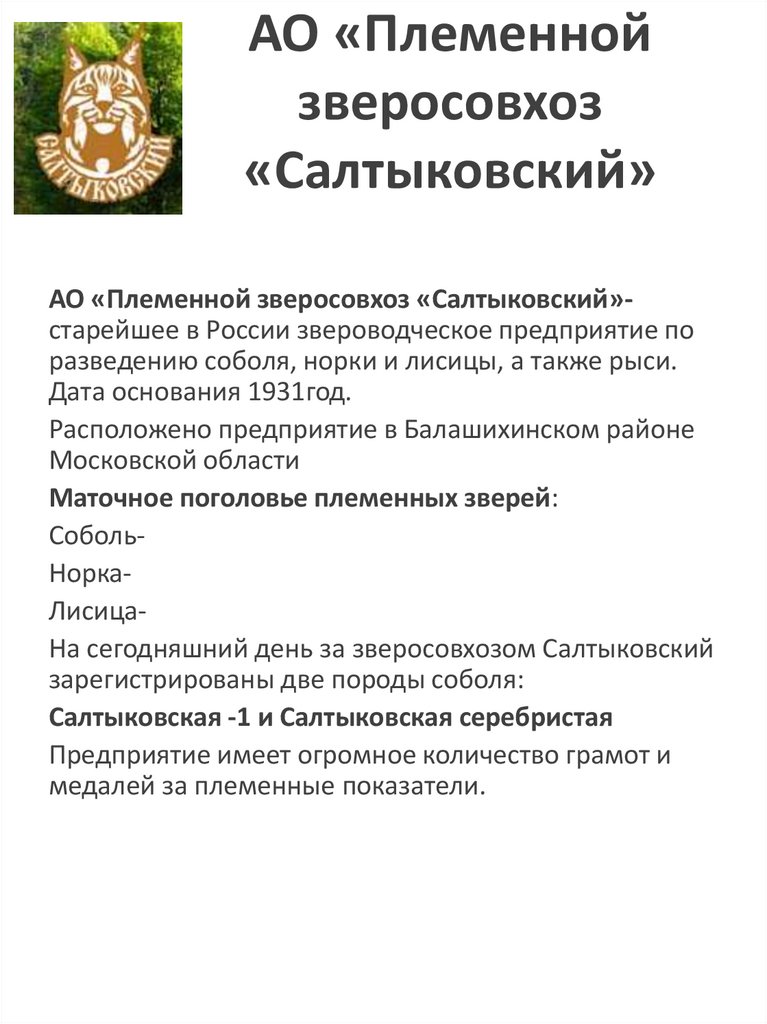 АО «Племенной зверосовхоз «Салтыковский»старейшее в России звероводческое предприятие по