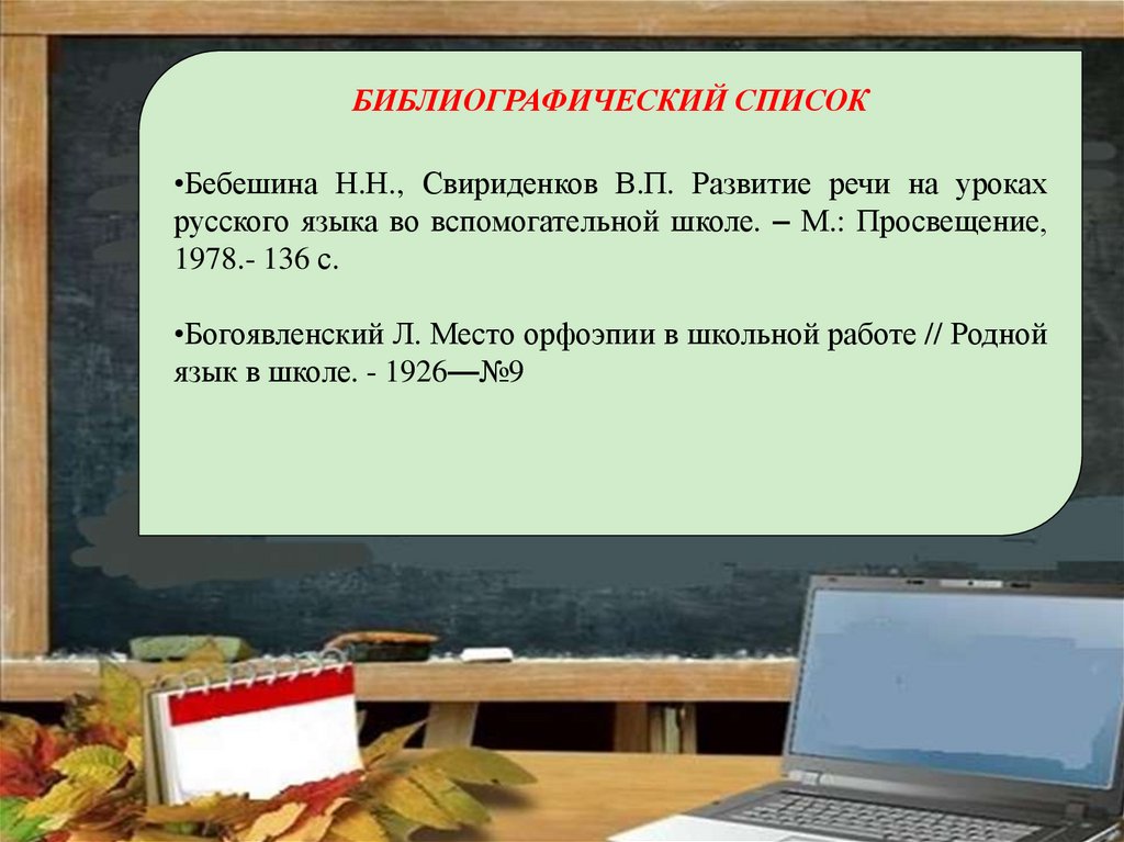 БИБЛИОГРАФИЧЕСКИЙ СПИСОК•Бебешина Н.Н., Свириденков В.П. Развитие речи на уроках
