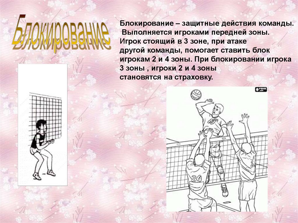 Блокирование – защитные действия команды.Выполняется игроками передней зоны.