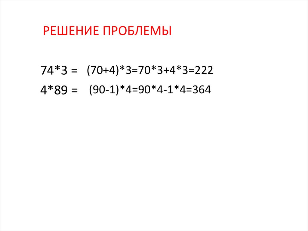 РЕШЕНИЕ ПРОБЛЕМЫ74*3 = (70+4)*3=70*3+4*3=222