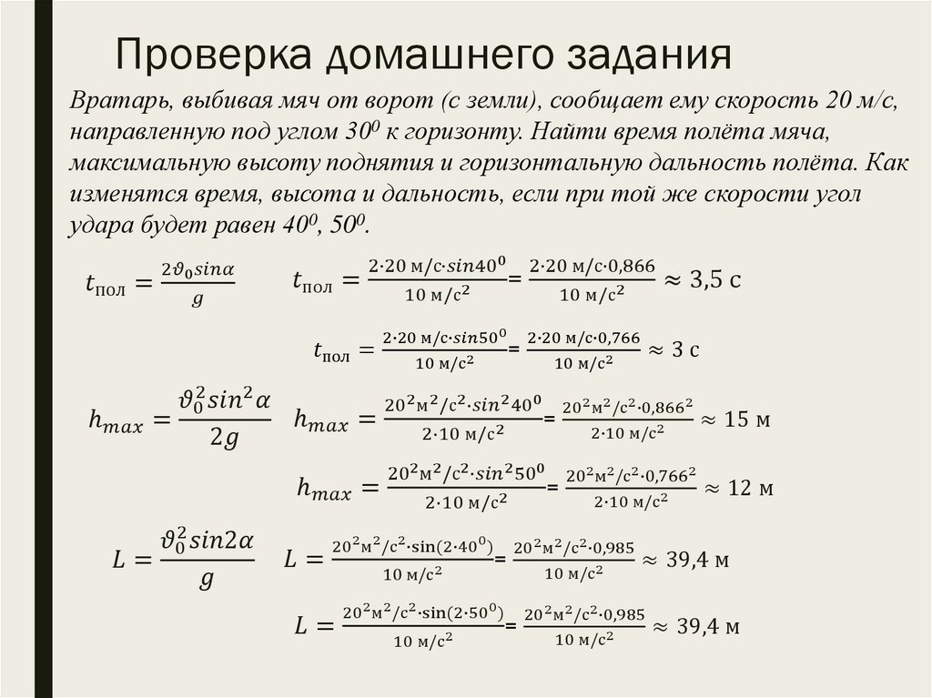 Проверка домашнего заданияВратарь, выбивая мяч от ворот (с земли), сообщает ему скорость 20 м/с,