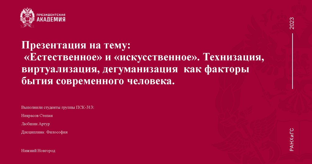 «Естественное» и «искусственное». Технизация, виртуализация, дегуманизация как факторы бытия современного человека