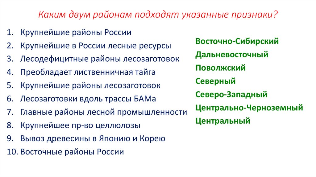 Каким двум районам подходят указанные признаки?1. Крупнейшие районы России