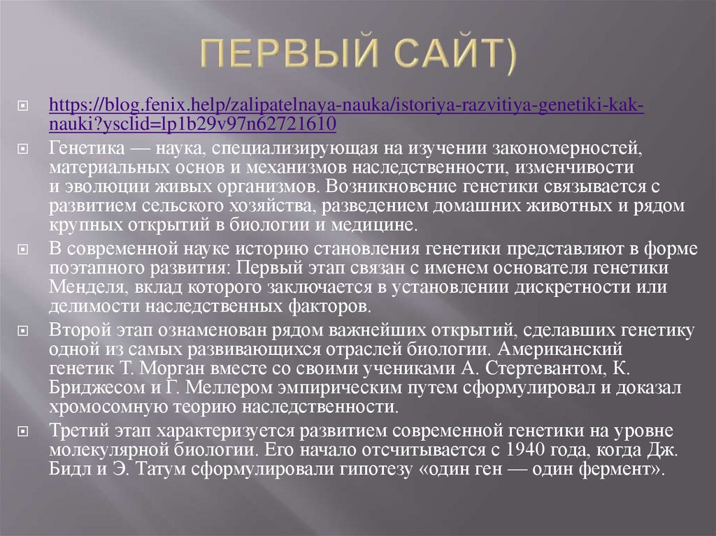 https://blog.fenix.help/zalipatelnaya-nauka/istoriya-razvitiya-genetiki-kaknauki?ysclid=lp1b29v97n62721610Генетика — наука, специализирующая на изучении закономерностей,