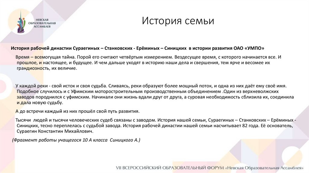 История семьиИстория рабочей династии Сураегиных – Станковских - Ерёминых – Синицких в истории развития ОАО «УМПО»