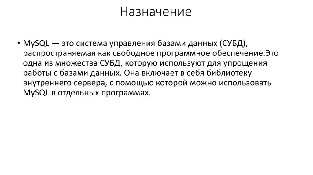 Назначение• MySQL — это система управления базами данных (СУБД),