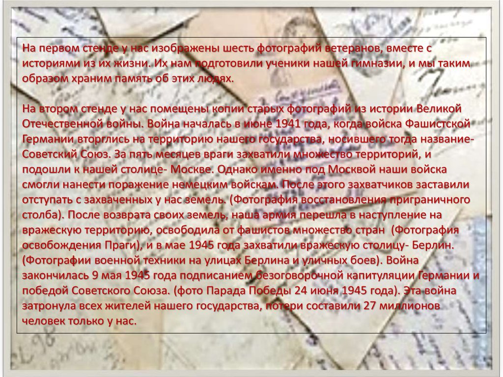 На первом стенде у нас изображены шесть фотографий ветеранов, вместе систориями из их жизни. Их нам подготовили ученики нашей гимназии, и мы таким