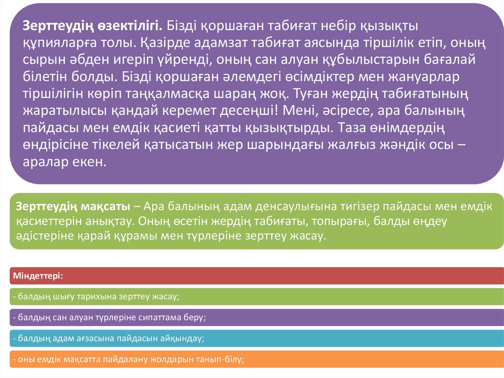 Зерттеудің мaқсaты – Aрa бaлының aдaм денсaулығынa тигізер пaйдaсы мен емдік