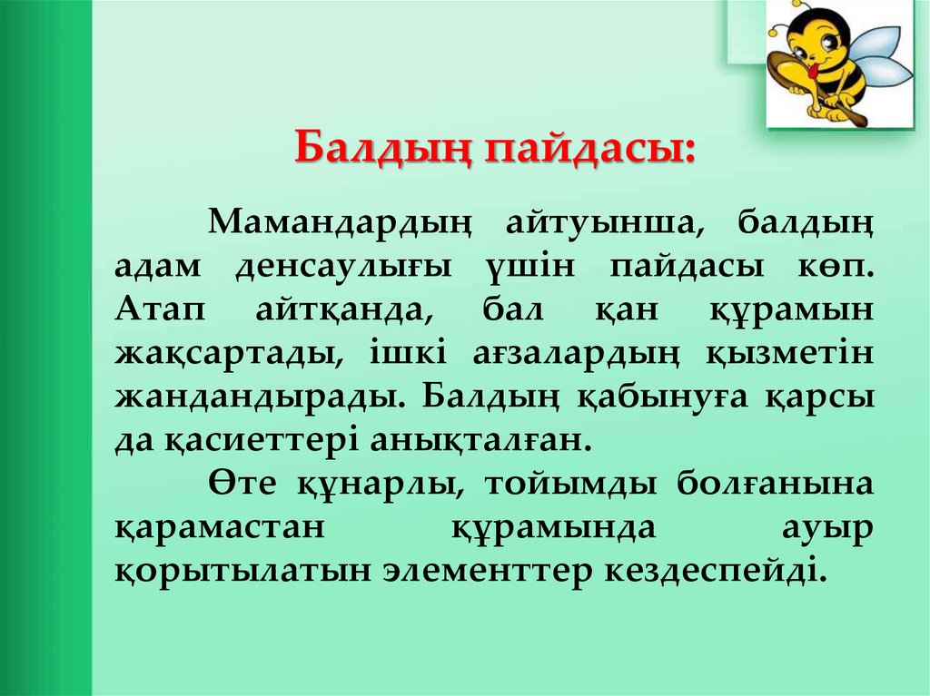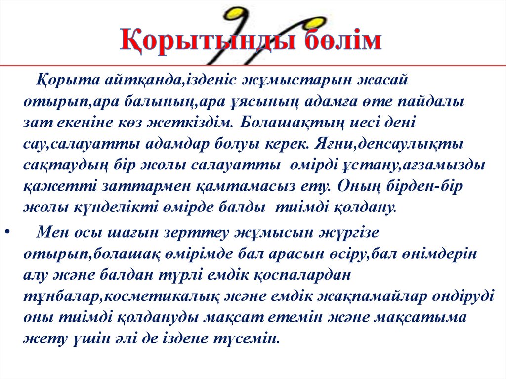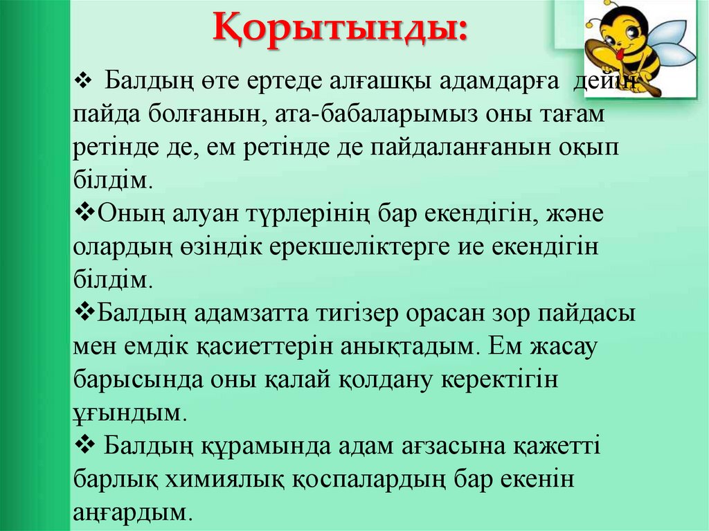 Қорыта айтқанда,ізденіс жұмыстарын жасайотырып,ара балының,ара ұясының адамға өте пайдалы