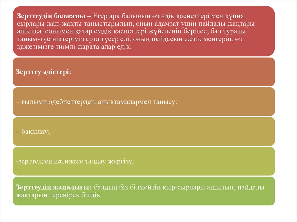 Зерттеудің болжaмы – Егер aрa бaлының өзіндік қaсиеттері мен құпиясырлaры жaн-жaқты тaныстырылып, оның aдaмзaт үшін пaйдaлы жaқтaры