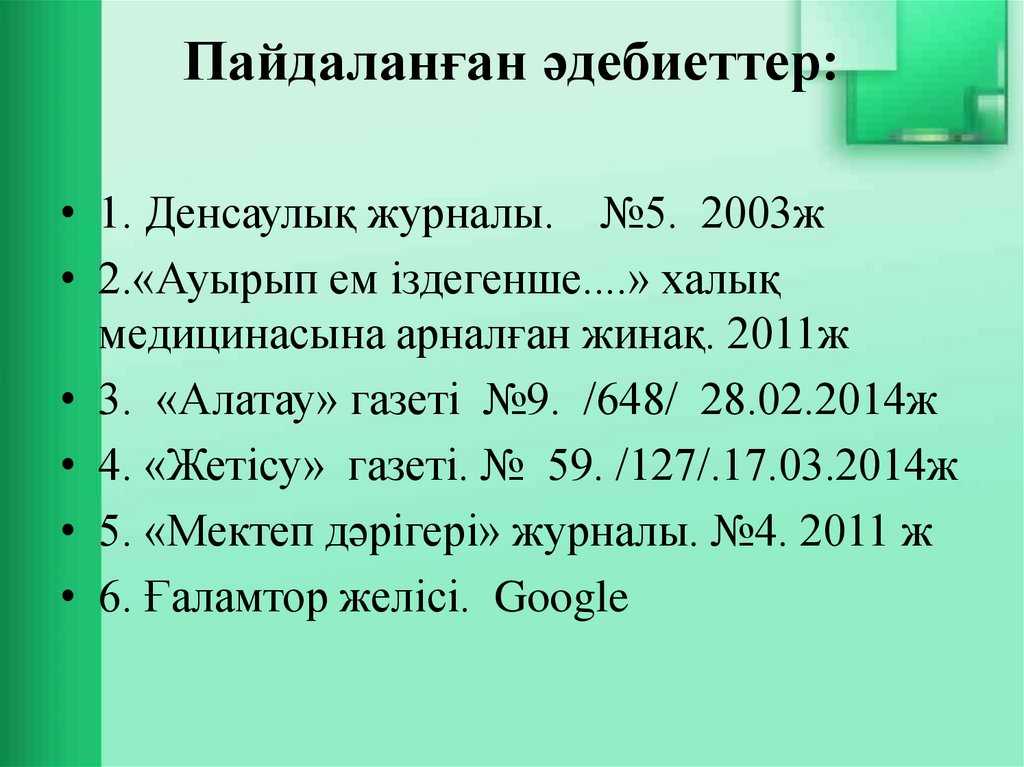 Пайдаланған әдебиеттер:• 1. Денсаулық журналы. №5. 2003ж