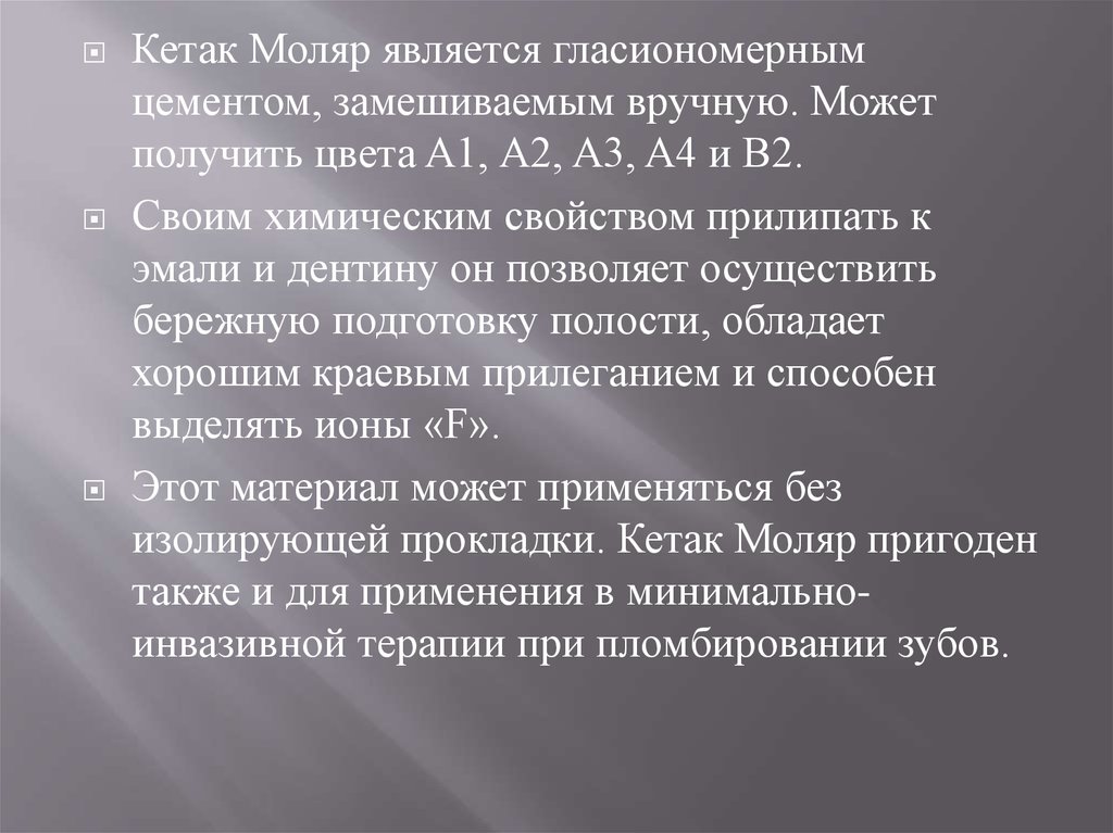 Кетак Моляр является гласиономернымцементом, замешиваемым вручную. Может