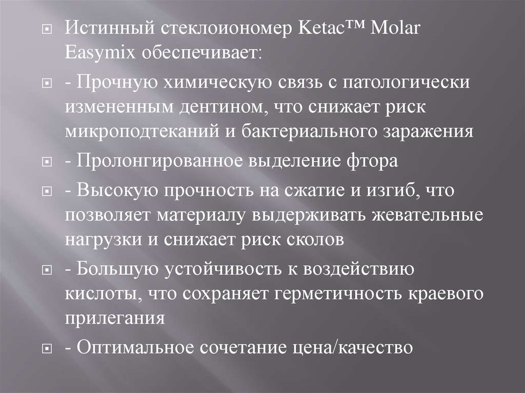 Истинный стеклоиономер Ketac™ MolarEasymix обеспечивает: