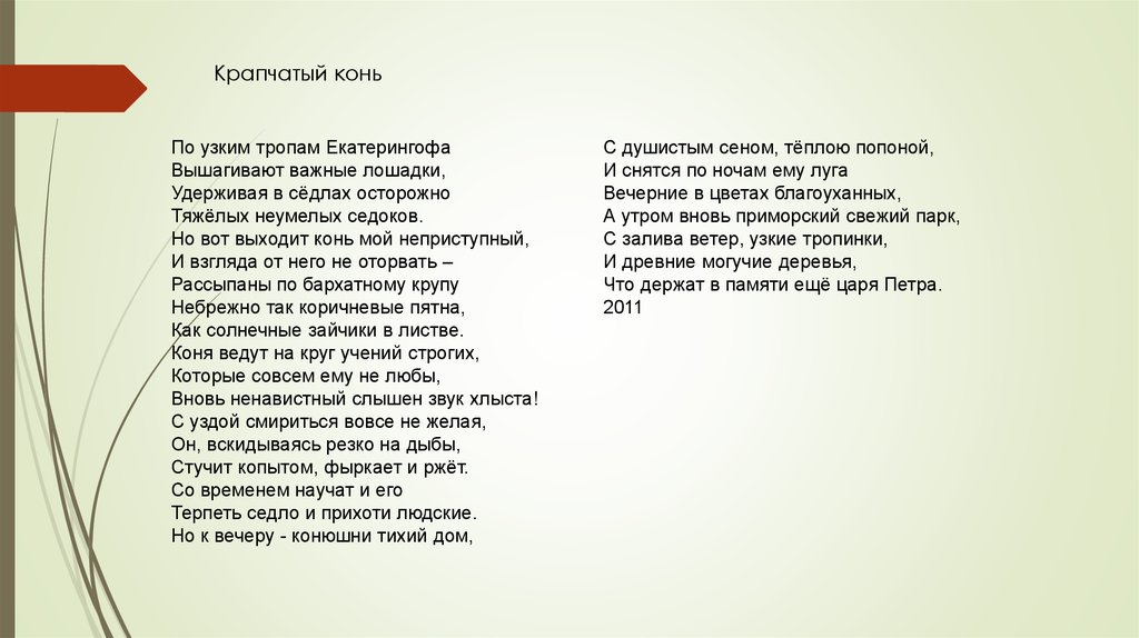 2. У Нарвской заставы закат Сквозь воздуха осеннего хрусталь На площади я вглядывалась вдаль: Там догорал закат над аркой Триумфальной Широк