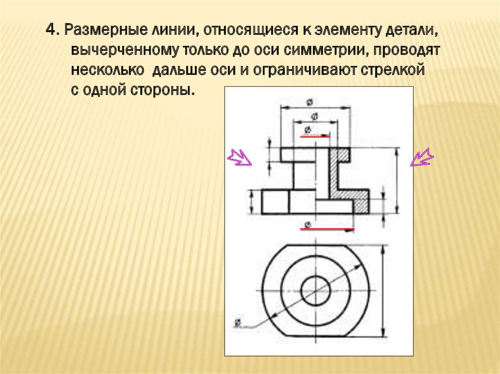 4. Размерные линии, относящиеся к элементу детали,вычерченному только до оси симметрии, проводят