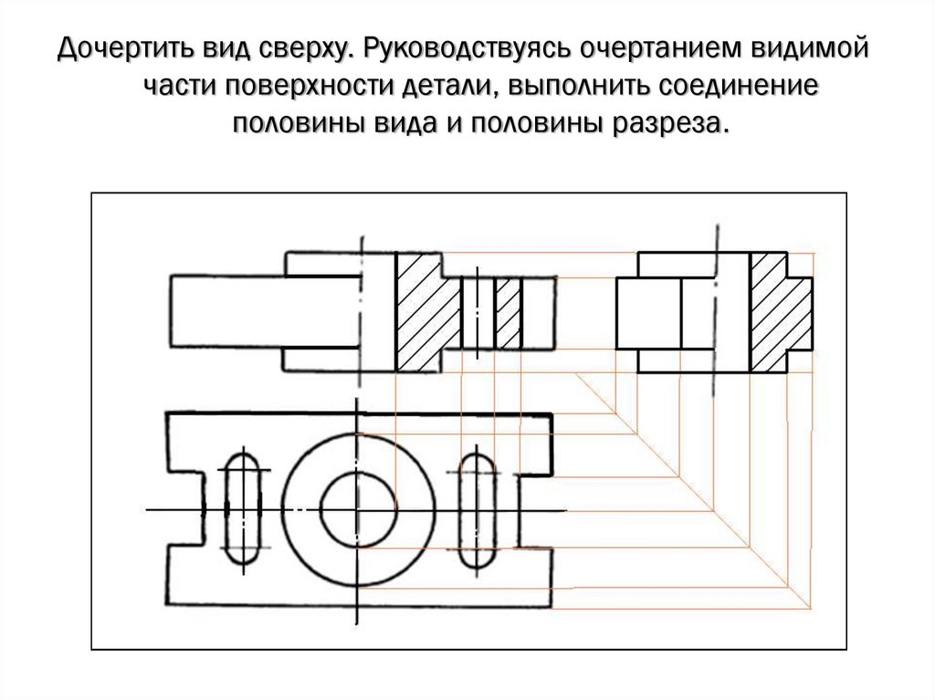 Дочертить вид сверху. Руководствуясь очертанием видимойчасти поверхности детали, выполнить соединение половины